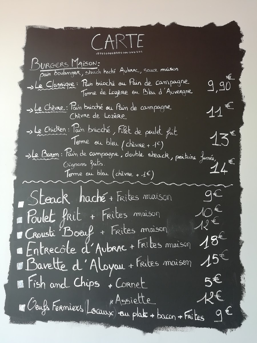 Pain de campagne Double steak hachés Aubrac Poitrine fumée, oignons frits Sauce maison, crudités Fromage au choix : Tome de Lozère ou Bleu de pays ou Chèvre de lozère